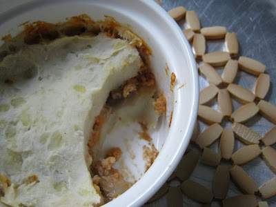 Já vi de batata, de mandioquinha (batata baroa), e como eu tinha inhame, cozinhei com as batatas, amassei, temperei com sal (um purê). Refoguei em duas colheres de azeite, cebola picadinha, milho verde, ervilhas, cogumelos, palmito, um tomate pequeno, e cheiro verde. Fiz porções individuais e assei em forno brando por 15 minutos. No dia seguinte esquentei no microondas o ramequin que havia sobrado e o sabor se manteve, bem como a textura. Não ficou com jeito de requentado. O inhame deixou o purê muito fofo, delicado e suave. Delícia!